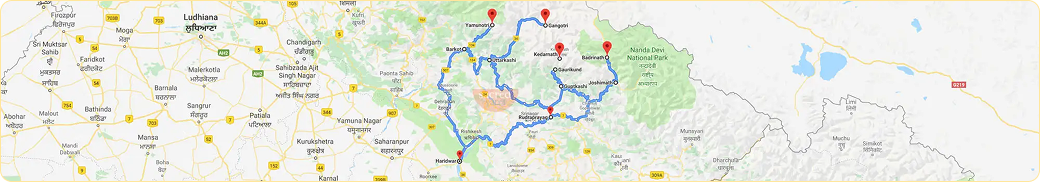 Haridwar → Rishikesh → Deo→Prayag → Tehri → Dharasu → Yamunotri → Uttarkashi → Gangotri → Gaurikund → Kedarnath → Joshimath → Badrinath.